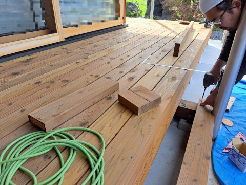 「木質化支援事業 デッキ工事②」取付け作業♪ 2024年11月2日 池田です。 塗装作業も終わり、現場取付に進んでおります。 デッキ工事は、現地の高さがポイントで少し違いますので、 現地で微調整しながら取り付けていきます。 <現場搬入の様子> <大引き、束取付け作業の様子> デッキ材取付けの様子です。 1枚ずつ、寸法確認しながら取り付けていきます。 <デッキ床材の様子> 現在位置 ホーム ブログ 「木質化支援事業 デッキ工事②」取付け作業♪