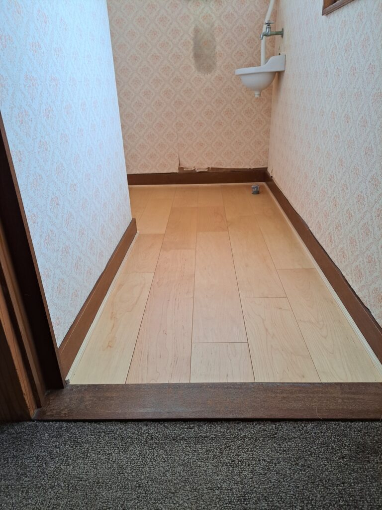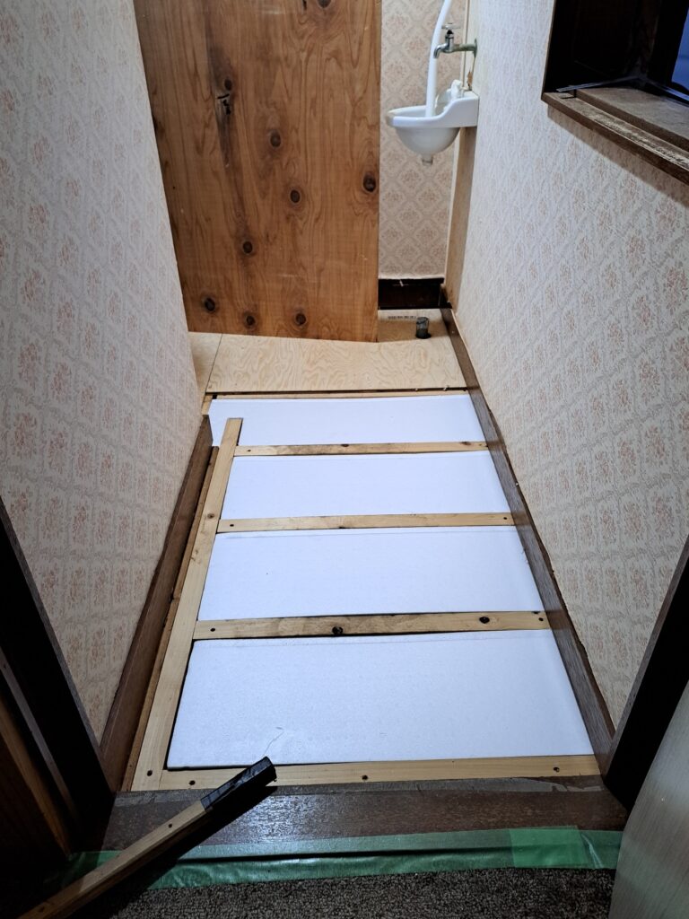 先日、トイレ工事をさせて頂きました。 既存の設備機器と床を外して、作業させて頂きます。床高さを調整しながら、断熱材を入れて床を仕上げさせて頂きました。