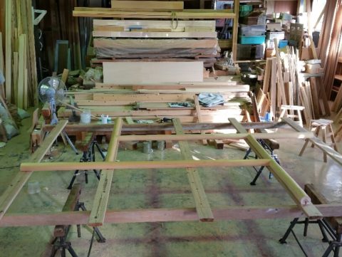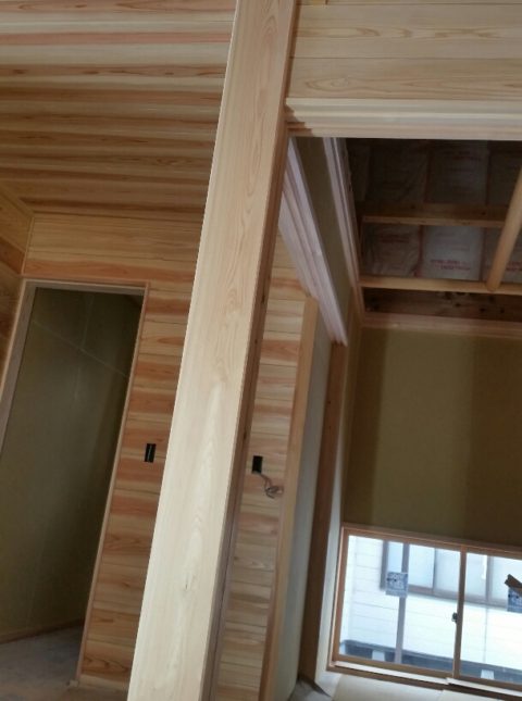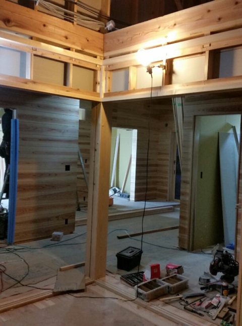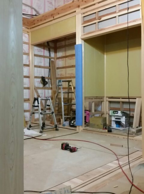 下立の家⑱ 和室の造作♪ 2018年11月30日 池田です。 和室の造作作業に入ってきました。 今回は、柱や造作材は桧を仕様させて頂いております。 イメージとしては、シンプルかつ品のあるお部屋に仕上げていきます。 天井作業の様子です。 天井竿は、少し細めの磨き丸太を利用して組んでいきます。 丸太なのであらかじめ作業場で仮組をし現場で取り付けていきます。 <作業場で仮組の様子> 桧6寸角と鴨居取付の様子です。 丁度良いサイズ感で存在感もバッチリです。 桧の良い香りがしますね~。 <桧6寸角と鴨居の様子> 現在位置 ホーム ブログ 下立の家⑱ 和室の造作♪