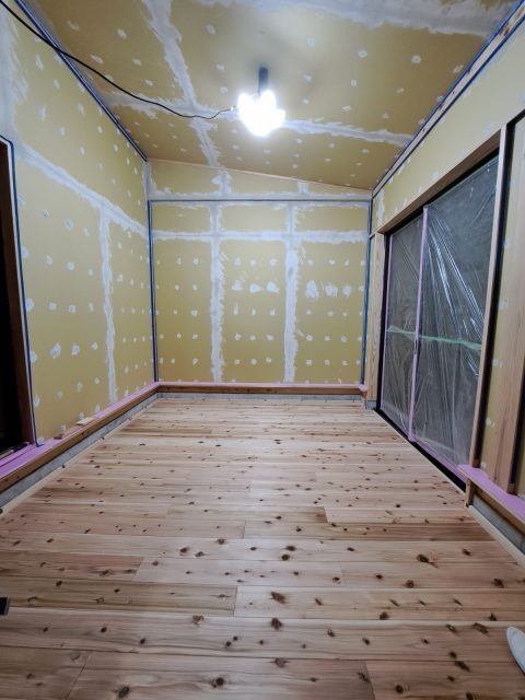 小さな小屋の制作③内部造作♪ 2025年2月10日 壁、天井に石膏ボードを張ります。 今回は、吉野石膏のCトップ材を壁仕上げとします。 <石膏ボード下地の様子> 床材は、杉の無垢フローリングです。 杉の床材は、断熱性能と調湿性能に優れている材料です。 また、暖かみある木の香りもとても良いですね。 <杉のフローリング張りの様子> 現在位置 ホーム ブログ 小さな小屋の制作③内部造作♪