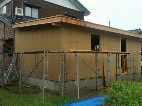 次に、外部をハイベストウッド(耐力壁)を張っていきます。