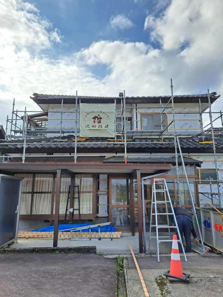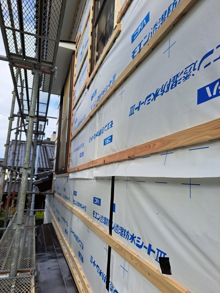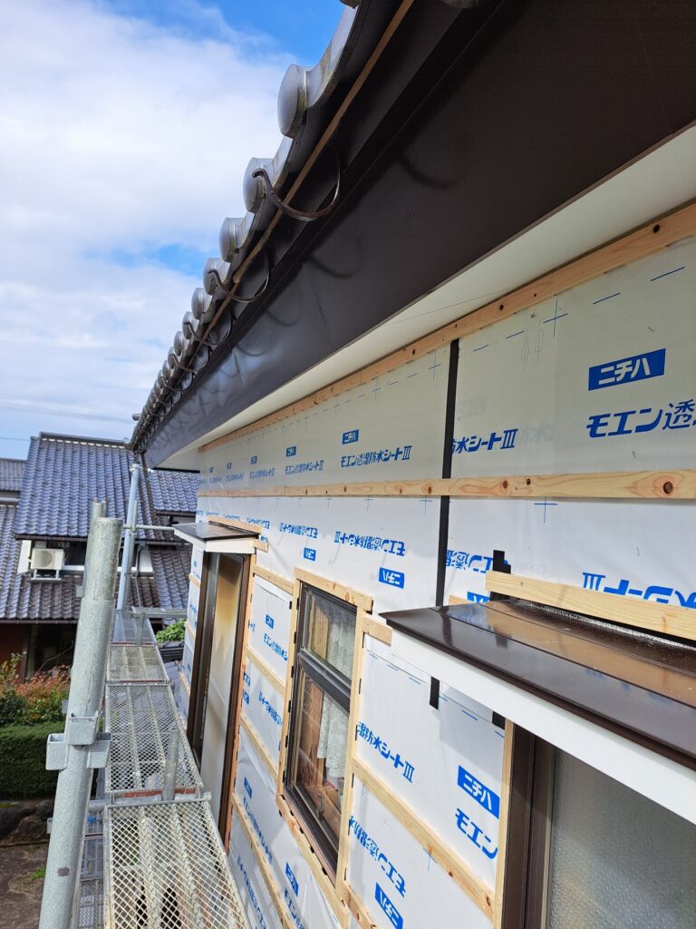 宇奈月の外壁工事② 塗装作業&下地作業 2025年11月20日 池田です。 現場の方は、塗装作業と下地作業に入っています。 塗装作業は、破風板や庇の板金部分はしっかりしているので、既存の上から、油性塗料で仕上げさせて頂きました。軒裏部分も、全体的に割れや破損が少ないため、水性塗料で仕上げさせて頂きました。 <塗装作業の様子> 外壁の外部下地作業の様子です。 今回は、既存外壁が塗膜剝離などがありましたので、防湿シートを張り、外部下地とさせて頂きました。下地は、ヒノキの通気胴縁を使うことで、壁内も空気を流動させます。 <外部下地の様子> 現在位置 ホーム ブログ 宇奈月の外壁工事② 塗装作業&下地作業