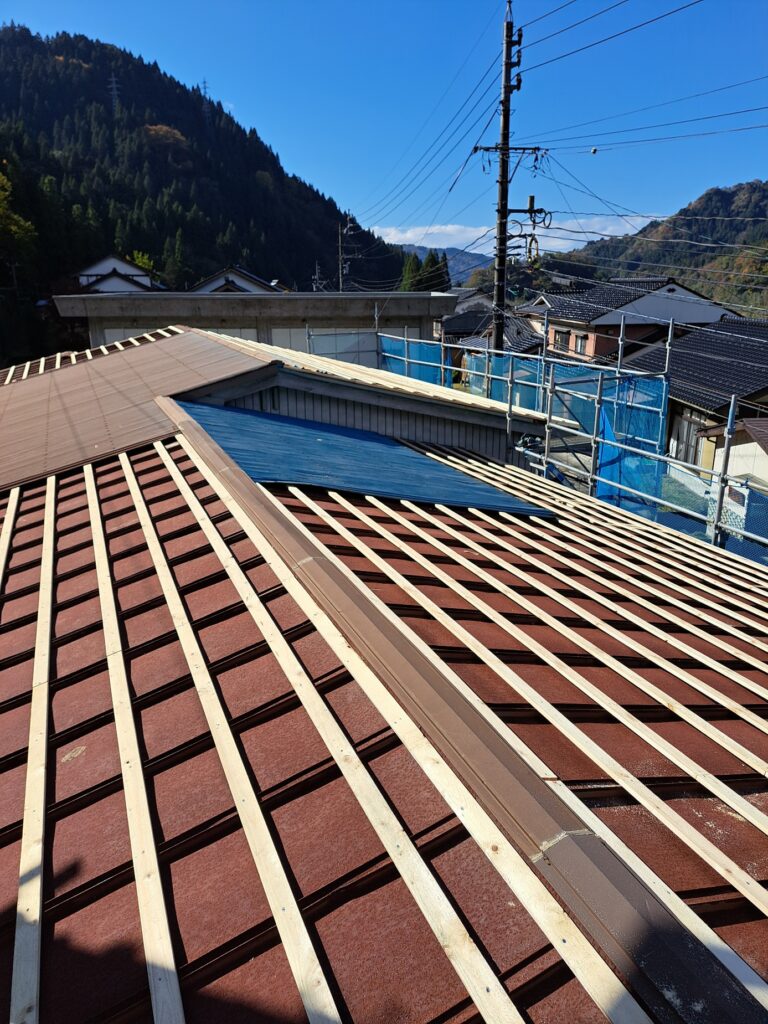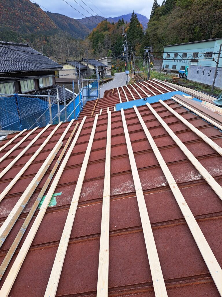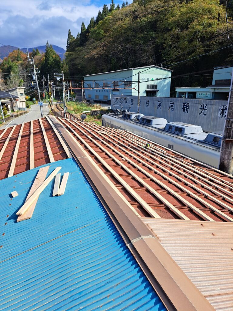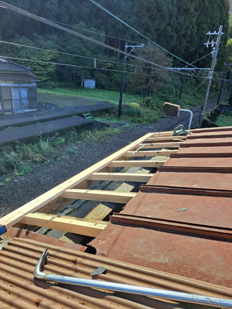 本宮駅の屋根改修工事② 屋根の下地作業。 2025年11月7日 池田です。 屋根改修工事、屋根下地の様子です。既存屋根の上に貫を固定していきます。 軒先の腐食部分は、屋根タルキから交換して強度を強めていきます。 現在位置 ホーム ブログ 本宮駅の屋根改修工事② 屋根の下地作業。