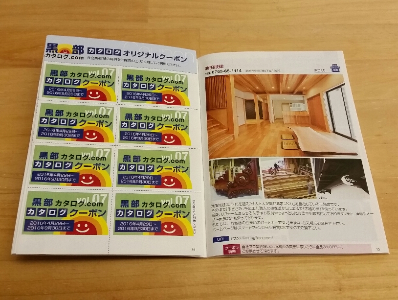 毎度お世話になっております。黒部カタログvol.7♪ 2016年5月6日 池田です。 毎度お世話になっております。「黒部カタログ.com」 VO.7と言う事で、今回も搭載させて頂きました♪ ありがとうございます。 黒部の事を調べたいならまずは、黒部カタログへ。 暮らし、美容、宿泊、施設、グルメなど いろいろな内容が詰まっている1冊です。 また、店舗や施設などクーポン券もありますのでお得な情報もありますよ~♪ 池田技建もクーポンを発行していますので気になる方は、 メールにて気軽にお問合せお願い致します。 現在位置 ホーム ブログ 毎度お世話になっております。黒部カタログvol.7♪