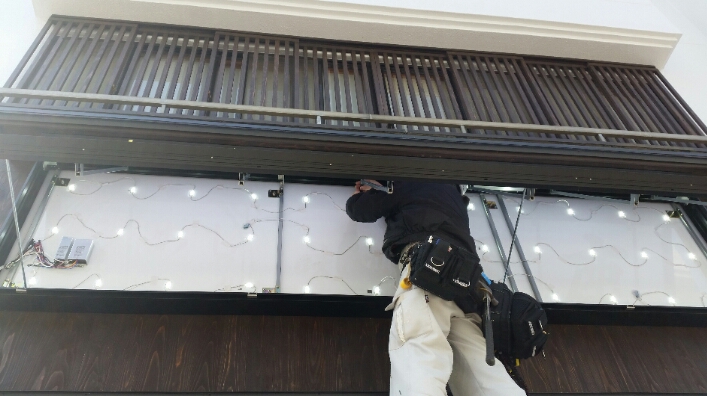 釜めしのお店⑧(リフォーム)♪ 2015年3月22日 池田です。 看板取付作業をしています。 今までは、縦の袖看板でしたが今回は、 正面部分に大きく持ってくることでお店の存在感を出していきます。 看板のサイズも3600x900なのでボリューム感たっぷりです。 中の照明器具は、LED仕様なので電気器具の取り替えなどの心配も 軽減されていきます。 看板裏の外壁材は杉板仕様です。 下部の化粧材と同様で杉材を仕様することでお店の柔らかさを 出していきます。 ~看板取付作業の様子~ ~杉板羽目板仕様~ ~看板内部、LED仕様~ 現在位置 ホーム ブログ 釜めしのお店⑧(リフォーム)♪