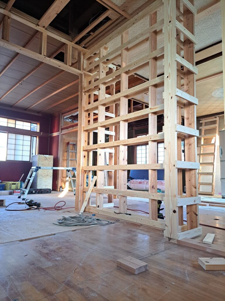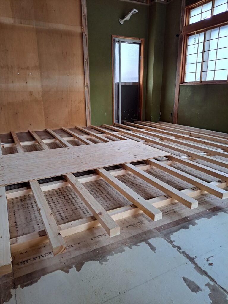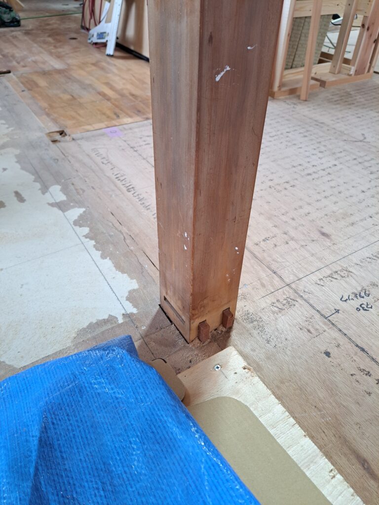 解体作業も終わり、地墨を出しながら壁の位置などを決めていきます。個人的にリフォーム工事の面白いところは、先人の職人さんたちが、どのような仕事をしていたのかを確認することが出来ます。 下記の画像は、敷居の納め方です。 縦と横のほぞを上手く利用して、仕事を納めていますね。