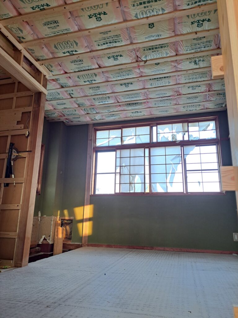 下地をした天井に断熱材を入れて、断熱効果を高めていきます。