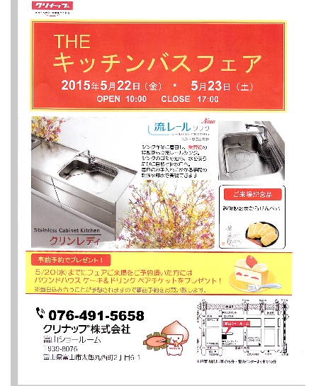 キッチンバスフェア♪ 2015年5月8日 クリナップさん 富山ショールームにて 「キッチンバスフェア」開催されます。 日時⇒2015年5月22日(金)~5月23日(土) 時間⇒10:00~17:00 場所⇒クリナップ株式会社 富山ショールーム 新築、リフォームなど水廻りに興味のある方は是非!! 現在位置 ホーム ブログ キッチンバスフェア♪