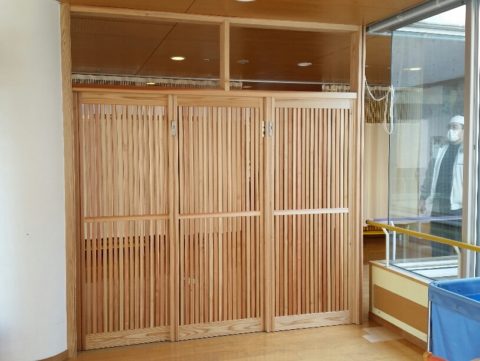 木製建具制作♪ 2019年3月5日 池田です。 先日、福祉施設の木製建具を制作させて頂きました。 もともとは、アルミ製の柵を使用していましたが、 今回は、木製建具で制作させて頂きました。 材質は杉材。縦格子のデザインにする事で 落ち着いた、暖かみある空間に仕上がりました。 ありがとうございました。 <既存アルミ柵> <木製建具 縦格子> 現在位置 ホーム ブログ 木製建具制作♪
