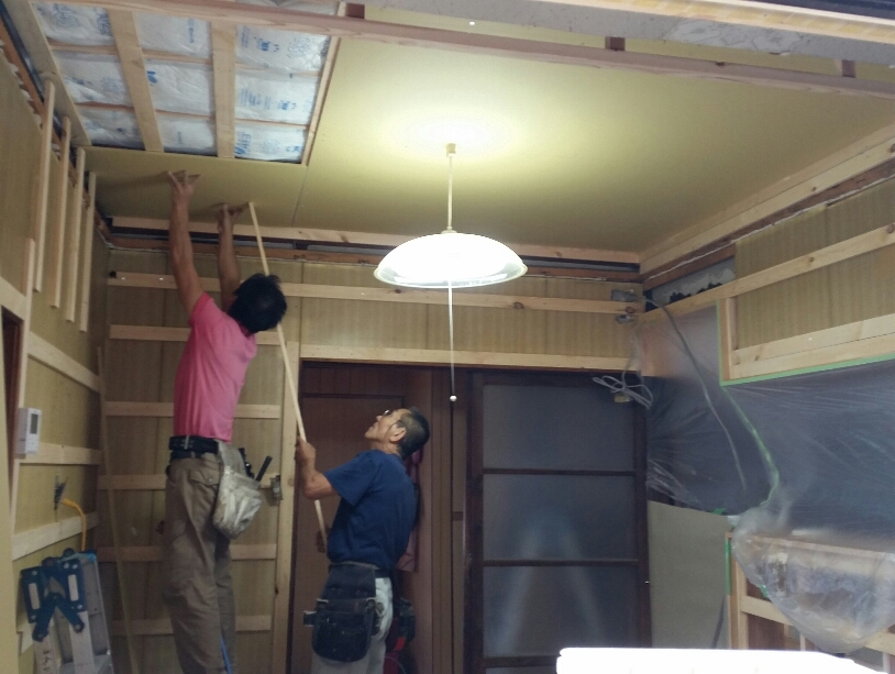 宇奈月の家④(LDKリフォーム) 2015年9月14日 池田です。 リビング、ダイニング部分の作業も終わり、最後にキッチンをリフォーム していきます。 今までは、I型キッチンで使用していましたが 生活環境を良くするために、今回のリフォームで I型キッチンから対面キッチンに変えていきます。 下地作業を終えてクロス下地のボードを 貼っていきます。 現在位置 ホーム ブログ 宇奈月の家④(LDKリフォーム)