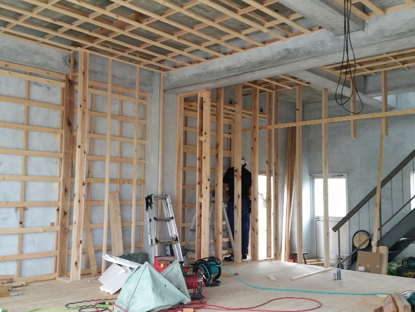 美容室②(店舗改装) 2015年9月18日 池田です。 床の下地作業が終わると、壁、天井の下地作業に進んでいきます。 建物が鉄筋コンクリートなのでコンクリート釘、ビスを使用しながら しっかりと施工していきます。 断熱材も床、壁、天井に入れて店舗内の断熱性能を上げていき、同時に カウンターなど棚、枠材を取り付けていきます。 ~内部下地作業~ ~内部造作作業~ 外部作業も同時に施工していきアプローチ部分のタイル下地として コンクリートを流し込み形を作っていきます。 ~外部サッシ取付&コンクリート作業~ 現在位置 ホーム ブログ 美容室②(店舗改装)