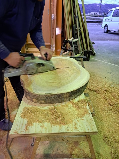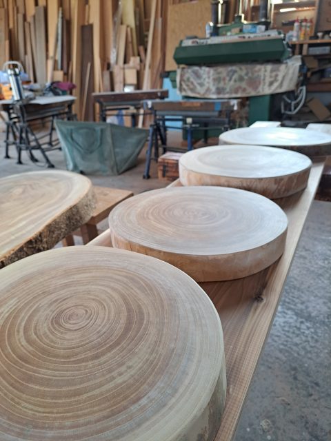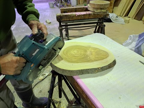 輪切りテーブルと椅子の制作②天板の削り作業♪ 2025年4月8日 池田です。 初めに天板から仕上げていきます。 現状のケヤキの板は、少しねじれていますので、電気かんなである程度のねじれを直していきます。 次に手のかんなでしっかりとねじれを直して、ベルトサンダーで表面を仕上げていきます。 今回、樹皮がしっかり残っている物は、そのまま仕上げたいと思います。 <天板の加工作業の様子> 現在位置 ホーム ブログ 輪切りテーブルと椅子の制作②天板の削り作業♪