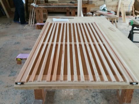 「平屋の家⑬」造作建具の製作♪ 2021年6月18日 池田です。 家の内外部も仕上がり、作業場では造作建具作業に進んでおります。 格子戸の製作です。 杉材を使用する事で柔らかく暖かい雰囲気に仕上げていきます。 <造作建具、杉の格子戸製作の様子> ガラス面は、乳白色を使用させて頂きました。 <仏間戸の製作> <障子戸の製作> 現在位置 ホーム ブログ 「平屋の家⑬」造作建具の製作♪
