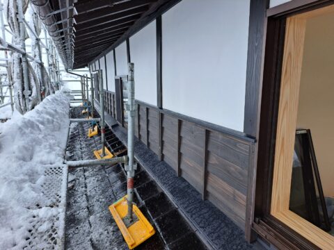 古民家リフォーム 外壁作業♪ 2023年12月23日 池田です。 年末が近づいて、雪景色になってきましたね。 外壁作業、杉板鎧張りの様子です。 板を重ねて張り合わせていく工法です。 古くから続く伝統的な外壁の仕上げ材です。 <杉板鎧張りの様子> 既存の雰囲気を残しながら落ち着いた良い感じに仕上がりました。 <外壁の様子> 現在位置 ホーム ブログ 古民家リフォーム 外壁作業♪