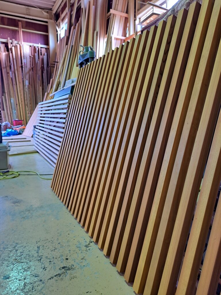 組立作業の様子です。あらかじめサッシの寸法など測っておくことで、材料を作業場でカットし仕上げていきます。現地では、取付け作業のみにする事で、材料も現場も綺麗になります。