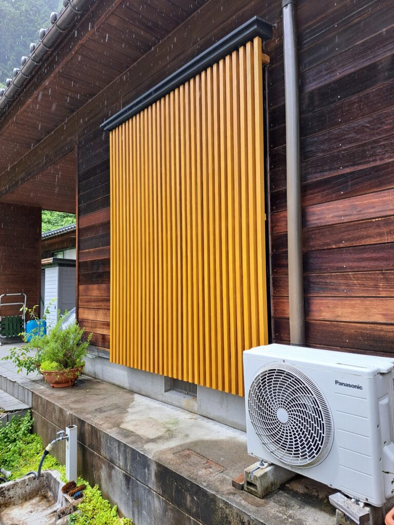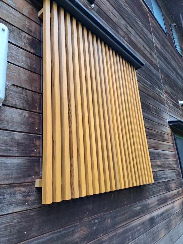 外部の木製格子制作② 現場取付け作業。 2025年8月19日 池田です。 外部の木製格子、取付け作業の様子です。 あらかじめ、作業場で寸法を決めて制作していますので、現場では取付け作業のみです。 しっかりと固定して、猿の侵入を防ぎます。 また、木製格子は外から見えにくく、室内から外が見えやすい造りになっており、程良く彩光も入ります。 格子の材質は杉のを仕様することで、落ち着きある雰囲気に仕上がりました。 ありがとうございました。 <木製格子の様子> 現在位置 ホーム ブログ 外部の木製格子制作② 現場取付け作業。