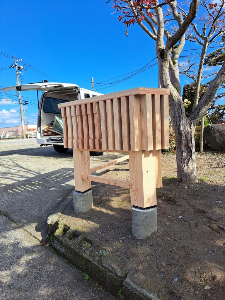 外部の木製看板制作③ 組み立て作業。 2025年11月30日 池田です。 木製看板制作、組み立て作業です。 天候にも恵まれスムーズに作業をさせて頂きました。 杉の縦格子とヒノキの構造体のバランスがとても良い感じに仕上がりました。 この後、塗装をしてから最後に看板を取り付けていきます。 <木製看板の組み立て作業> 現在位置 ホーム ブログ 外部の木製看板制作③ 組み立て作業。