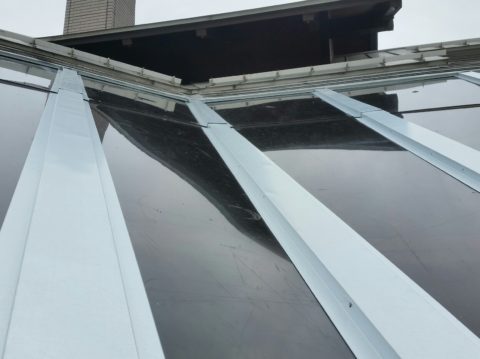 屋根部分は、上部からポリカ板を敷いて笠木部分を板金作業で包んでいきます。