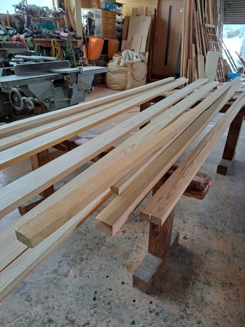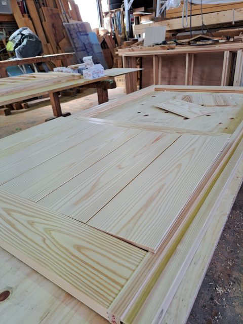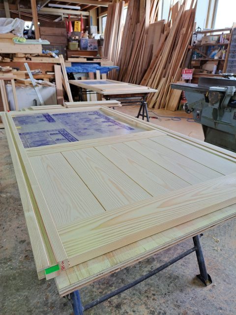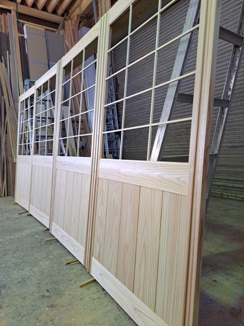 木製建具を制作させて頂きました♪ 2025年3月1日 池田です。 3月に入りましたね。まだまだ寒い日が続いています。 木製建具を制作させて頂きました。 先ず初めに、木材の加工作業に入ります。 今回は、杉材を使用させて頂きました。 <木材加工の様子> 既存の建具と雰囲気を合わせていく為に腰部分に 杉板を張り合わせていきます。 <腰板取付けの様子> 次に格子とポリカ板を取り付けて仕上げていきます。 塗装は、水性ステイン系を使用させて頂きました。 <杉の木製建具の様子> 現在位置 ホーム ブログ 木製建具を制作させて頂きました♪