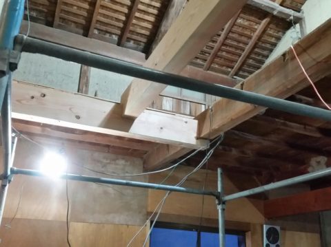 納屋のリフォーム♪続き 2022年4月15日 池田です。 納屋のリフォーム、床の補強作業をしています。 既存の柱、梁に仕口を彫りこみ新しく梁を入れて補強していきます。 梁を入れる事で床の補強と共に建物の躯体部分も同時に補強していきます。 <梁を入れて補強作業の様子> 作業場では、階段の段取りをしています。 高さ、長さを測って手刻みで加工していきます。 <階段加工の様子> 現在位置 ホーム ブログ 納屋のリフォーム♪続き