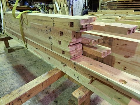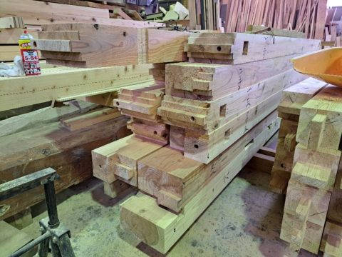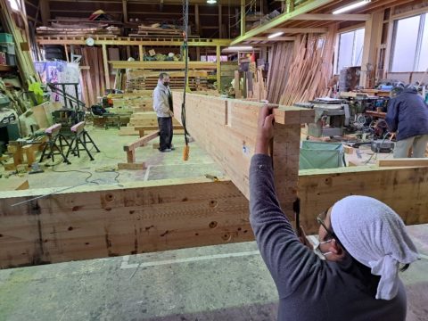 車庫新築工事、手刻み作業~♪ 2022年12月10日 池田です。 墨付け作業を終えた材料を 次に、手刻み作業で加工して仕上げていきます。 杉とヒノキの香りがとても良いですね~。 車庫の中央に架かる大きな修正梁の様子です。 大きな材料や重要な材料は、 あらかじめ作業場で仮組を行います。 そうする事で、建て方作業を効率良く進めていきます。 現在位置 ホーム ブログ 車庫新築工事、手刻み作業~♪