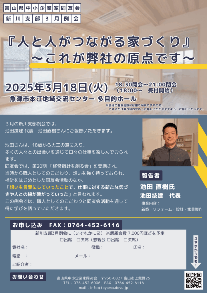 富山中小企業家同友 会新川3月例会。 2025年3月18日 池田です。 本日、報告者として出席させて頂きます。 何事もチャレンジ精神が必要ですね。勉強させて頂きます。 よろしくお願いいたします。 現在位置 ホーム ブログ 富山中小企業家同友 会新川3月例会。