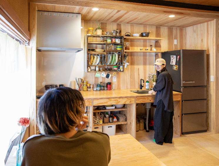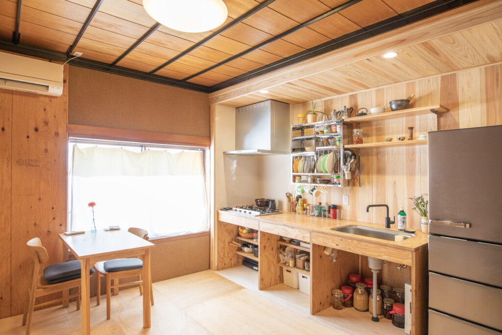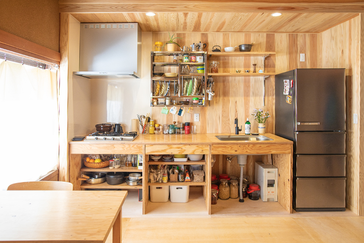 1階がカフェ、2階が住まいという生活スタイル。床貼りや壁の左官は夫婦自ら手を動かして工事を行い、キッチンの造作は弊社が担当。「相談しやすくて、しかも施工が丁寧。設計図通りに作って収めるだけじゃなく見栄えを考え微調整をするとか。現場も毎日きれいにして帰ってくれました。そういう姿を見て、ますます信頼が深まった」と若林さんは振り返ります。「完成後も、ちょっとした不具合にすぐ対応していただけるので大助かりです」