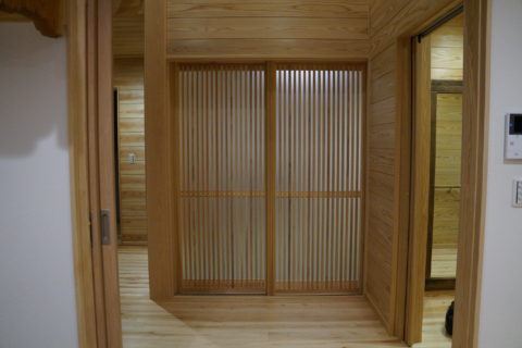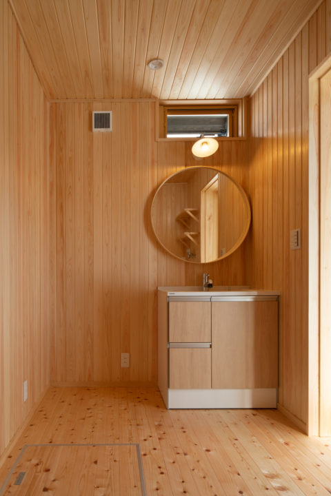 <洗面室 桧板張り>