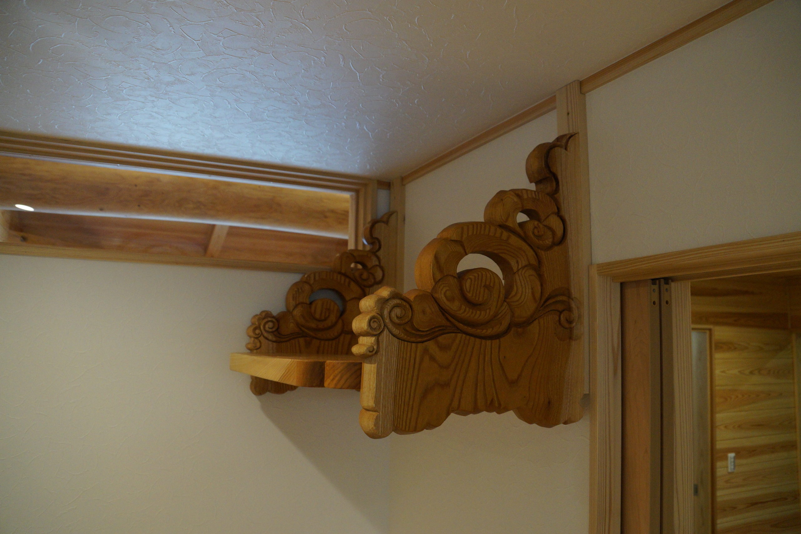 神棚⑤ ケヤキ 2024年10月23日 荒彫りである程度カタチを造りながら、最後に仕上げ彫りで凹凸を付けていきます。材質は、ケヤキを使用させて頂きました。 彫り作業の後は、塗装作業で仕上げていきます。今回は、自然塗料を使用させて頂きました。木目柄が引き立ち、柔らかく重厚感のあるイメージに仕上がりました。 神棚制作させて頂きました♪ リフォーム 店舗&施設 新築 オーダーメイド家具 無垢テーブル 神棚・神具など 階段 家具・カウンター 建具 その他 現在位置 ホーム 施工実績 オーダーメイド家具 神棚・神具など 神棚⑤ ケヤキ